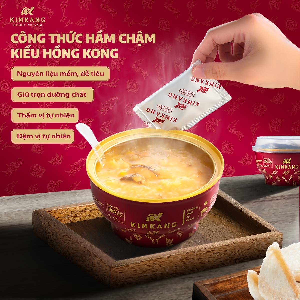Cháo Tổ Yến Bào Ngư Sò Điệp KimKang được chế biến từ các nguyên liệu thượng hạng, nấu theo công nghệ hầm chậm kiểu Hong Kong. Bí quyết này giúp hạt cháo bung đều, sánh mịn, hòa quyện cùng vị ngọt thanh tự nhiên của hải sản và hương thơm từ các loại gia vị, mang lại bữa ăn ngon miệng, ấm bụng và dễ tiêu hóa cho cả gia đình.