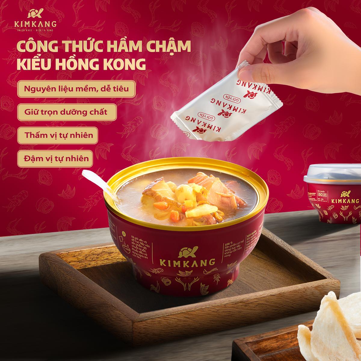 Súp Tổ Yến Đùi Gà Hầm Sâm và Trùng Thảo KimKang là sự kết hợp giữa nguyên liệu tự nhiên và công nghệ hầm chậm kiểu Hong Kong. Phương pháp này giúp nước súp trong, giữ được vị ngọt đậm đà từ xương và hương thơm đặc trưng của các thành phần, mang lại cảm giác ấm bụng, ngon miệng. Sản phẩm là lựa chọn tiện lợi, giàu hương vị cho bữa ăn của cả gia đình.