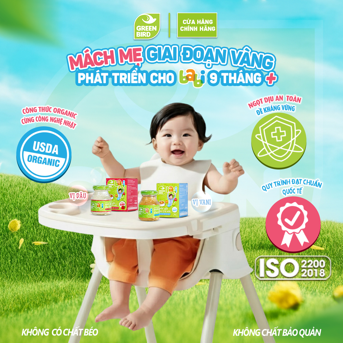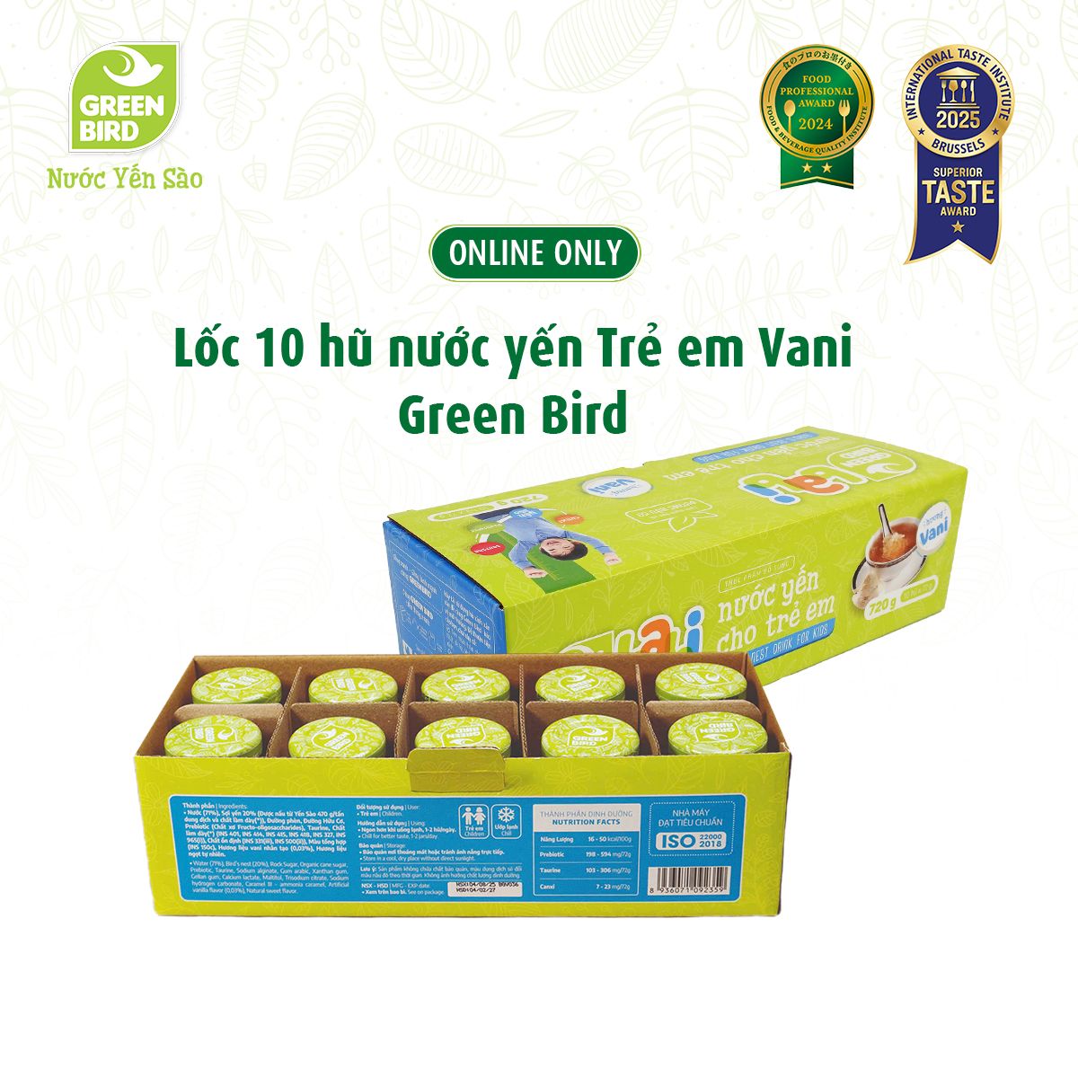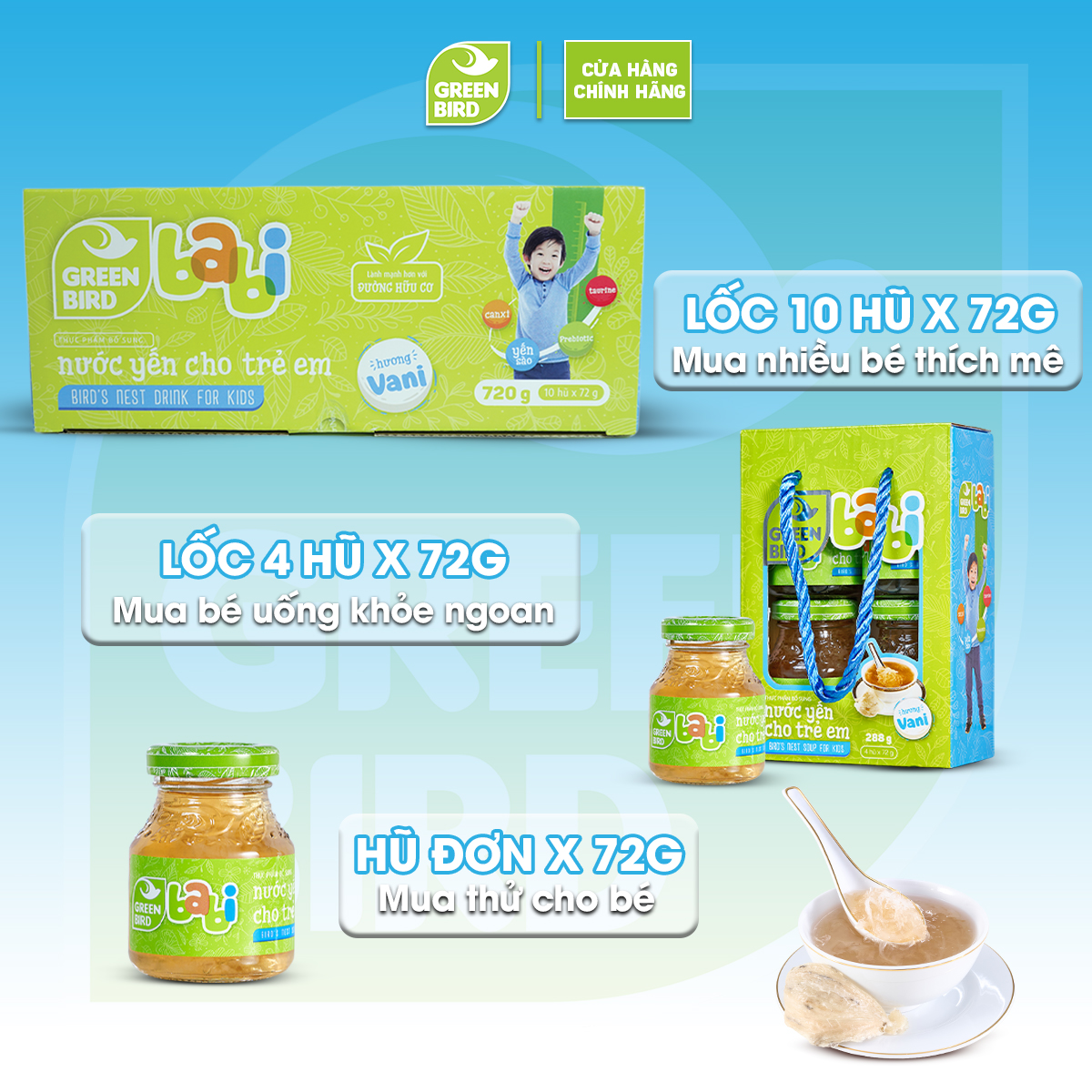 Green Bird Babi - Nước Yến Cho Trẻ Em Hương Vani là sự kết hợp dinh dưỡng từ 20% sợi yến cùng Taurine, Lysine và Canxi - những dưỡng chất cần thiết cho sự phát triển của trẻ. Vị ngọt nhẹ từ đường phèn - đường hữu cơ; hòa quyện với hương Vani cao cấp từ cây hoa Vani tự nhiên. Hỗ trợ bé dễ dàng hấp thụ dinh dưỡng mỗi ngày. Nước Yến Green Bird Babi là người bạn đồng hành lý tưởng cùng mẹ trong giai đoạn lớn khôn của trẻ.