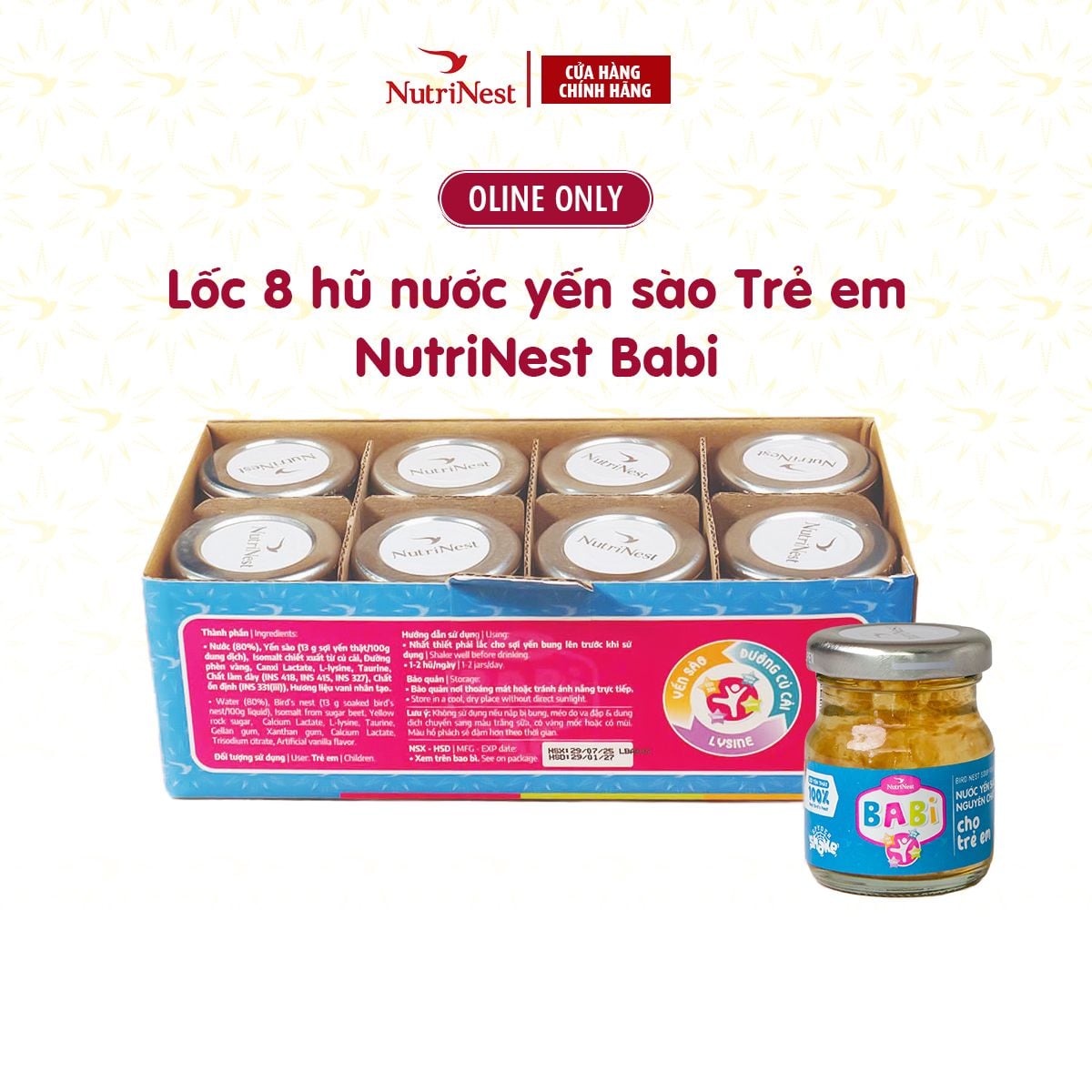 NutriNest Babi – sản phẩm nước yến cao cấp dành riêng cho trẻ em, với sợi yến mềm tự nhiên, vị ngọt thanh từ đường kiêng từ củ cải đường tự nhiên và hương Vani cao cấp chiết xuất từ hoa Vani tự nhiên. Được chưng theo phương pháp truyền thống kết hợp công nghệ hiện đại, NutriNest Babi giữ trọn hương vị tinh khiết và giá trị dinh dưỡng.