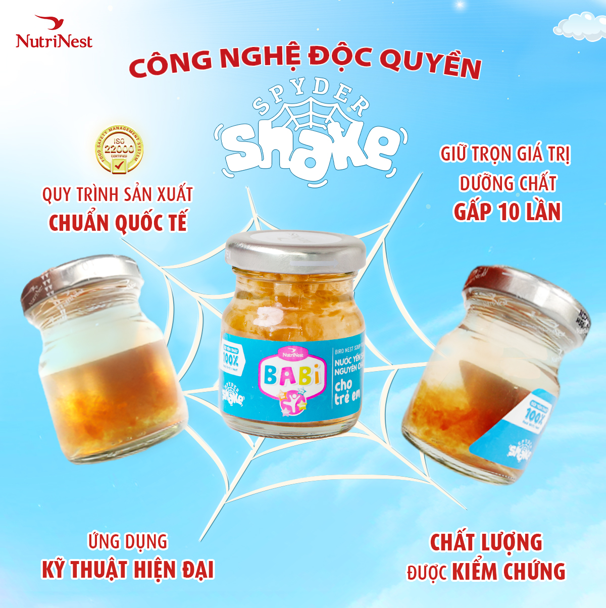NutriNest Babi được chưng theo công nghệ SpyderShake trong quy trình khép kín và tiệt trùng hiện đại, giúp cố định sợi yến khi gia nhiệt. Nhờ đó, sợi yến thật giữ nguyên cấu trúc với đặc trưng sợi không đều, màu ngả hổ phách sau nấu – dấu hiệu nhận biết yến thật. Công nghệ này đồng thời bảo đảm vệ sinh an toàn thực phẩm và tối ưu hóa bảo toàn dưỡng chất, hiệu quả vượt trội (đến gấp 10 lần).